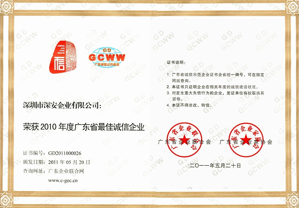 深安企業(yè)獲得“2010年度廣東省最佳誠信企業(yè)”榮譽(yù)稱號