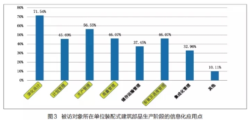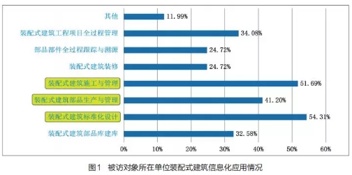 為了了解裝配式建筑智慧建造的現(xiàn)狀,我們委托專業(yè)調(diào)研公司由PC端、手機(jī)微信端和郵箱進(jìn)行調(diào)查問卷鏈接推送,共收到267份問卷。被訪對(duì)象單位類型包括政府部門、建設(shè)開發(fā)單位、勘察設(shè)計(jì)單位、科研單位等,被訪對(duì)象來自華北、華東、華南、華中等全國多個(gè)地區(qū)。調(diào)查結(jié)果顯示,在裝配式建筑信息化應(yīng)用情況中,裝配式建筑標(biāo)準(zhǔn)化設(shè)計(jì)、裝配式建筑施工與管理、裝配式建筑部品生產(chǎn)與管理應(yīng)用比例靠前,如圖1所示。