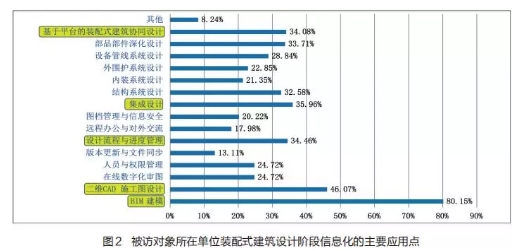 在設(shè)計(jì)階段,應(yīng)用BIM技術(shù)進(jìn)行裝配式建筑設(shè)計(jì)建模是最主要的應(yīng)用點(diǎn),應(yīng)用最多、占比最高。其次是二維CAD施工圖設(shè)計(jì)、集成設(shè)計(jì)、基于平臺(tái)的裝配式建筑的協(xié)同設(shè)計(jì)等,如圖2所示。