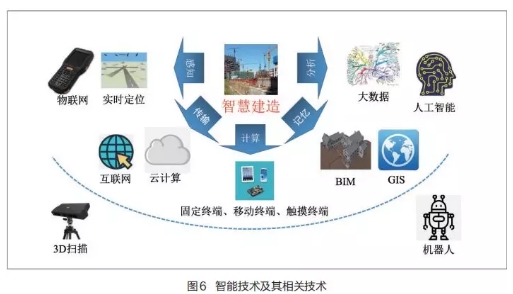 為了使裝配式建筑建造過程實(shí)現(xiàn)智慧建造,就需要應(yīng)用相關(guān)的智能技術(shù),從而實(shí)現(xiàn)感知、傳輸、計(jì)算、記憶、分析等功能。這些智能技術(shù),感知有物聯(lián)網(wǎng)技術(shù)、實(shí)時(shí)定位技術(shù),傳輸有互聯(lián)網(wǎng)技術(shù)、云計(jì)算技術(shù),記憶有BIM模型、GIS數(shù)據(jù),等等。另外,大數(shù)據(jù)、人工智能、3D掃描、機(jī)器人等也都是一些實(shí)現(xiàn)智慧建造所必須具備的技術(shù)。(圖6)