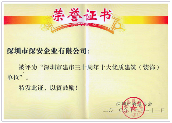 2011年1月5日,深圳市質(zhì)量協(xié)召開2011年市質(zhì)量年會(huì)、市質(zhì)量工作者新年聯(lián)誼會(huì)暨深圳市建市30周年優(yōu)質(zhì)單位及卓越質(zhì)量領(lǐng)袖頒獎(jiǎng)典禮,對(duì)深圳市建市30周年走“以質(zhì)取勝”之路、在促進(jìn)全市質(zhì)量事業(yè)進(jìn)步方面作出重要貢獻(xiàn)的一批優(yōu)秀企業(yè)、卓越質(zhì)量人物進(jìn)行了表彰,深安企業(yè)被評(píng)為“深圳市建市30周年十大優(yōu)質(zhì)建筑(裝飾)單位”、張銓總經(jīng)理獲“深圳市建市30周年卓越質(zhì)量領(lǐng)袖獎(jiǎng)”榮譽(yù)稱號(hào)。