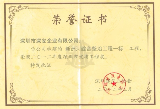 由深安企業(yè)施工總承包的“新洲河綜合整治工程一標”工程,最近被深圳建筑業(yè)協(xié)會評為2012年度深圳市優(yōu)質工程獎。